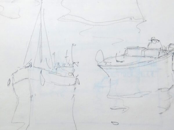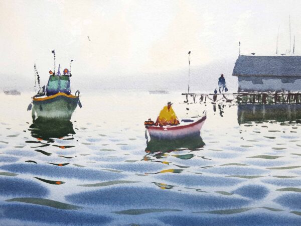 I den här lektionen målar jag ett hamnmotiv med en person som åker motorbåt, båtar, brygga och ett hamnhus. I en modul visar jag hur du kan tänka och skissa kring hur båtar kan se ut. Jag brukar även designa en miniatyrskiss hur man kan placera sina båtar och jobba från förlagor. Det är en del utmaningar att måla vatten och båtar och det tar tid att lära sig alla delar man behöver för att måla motivet. Du kan pausa, stanna och streama filmen i din egen takt och måla ett liknande motiv.