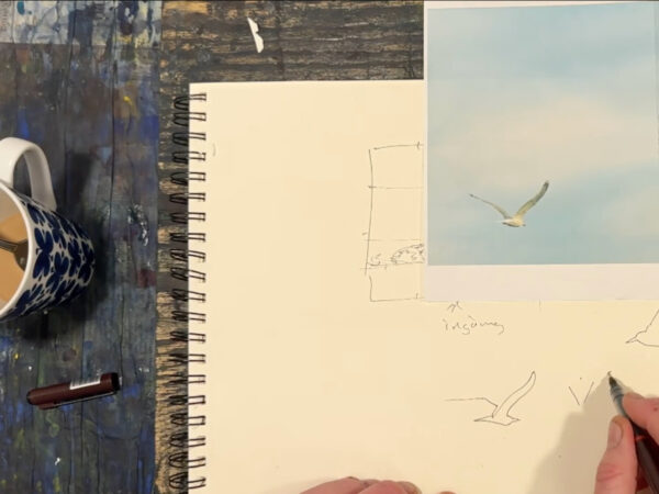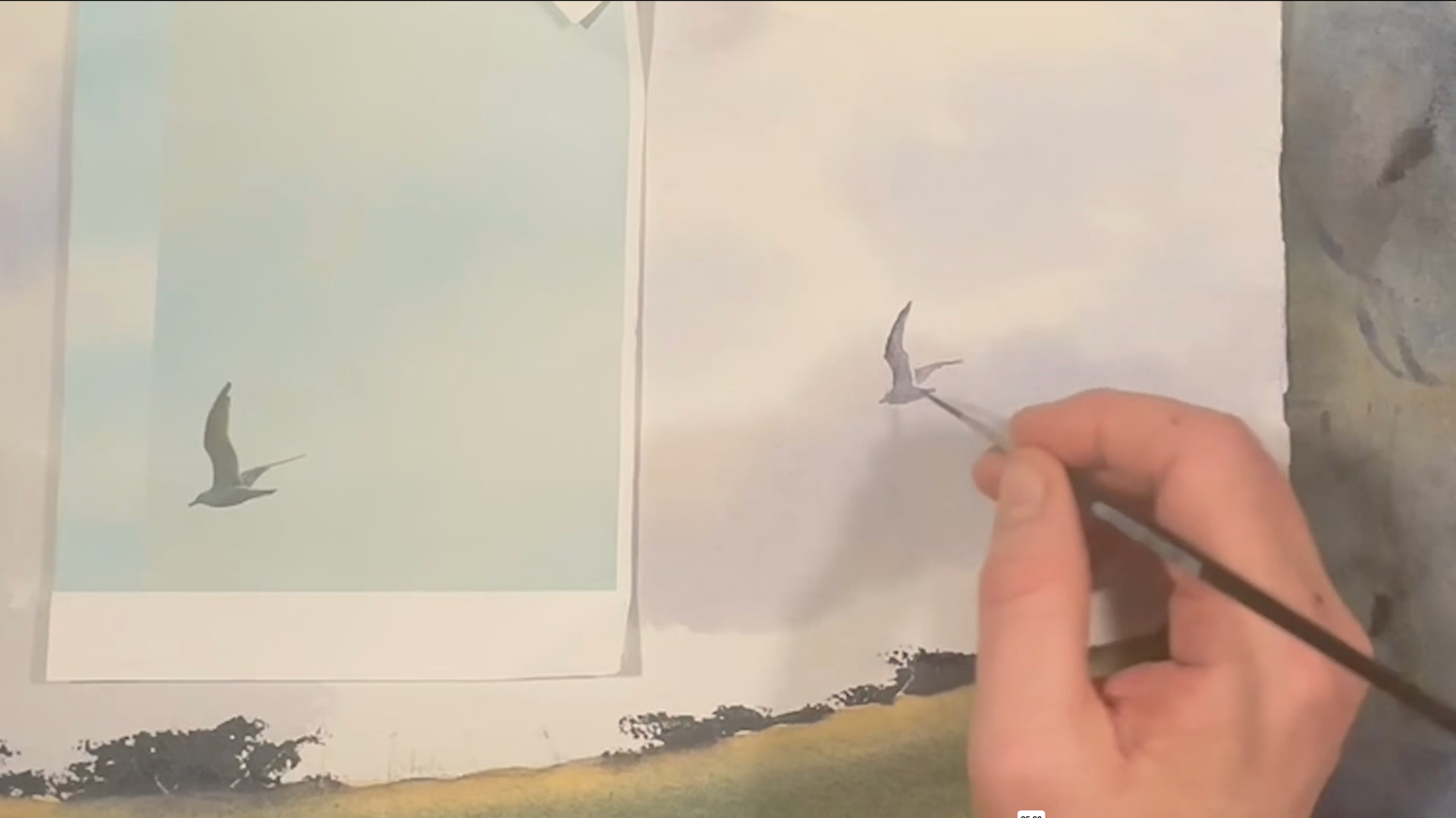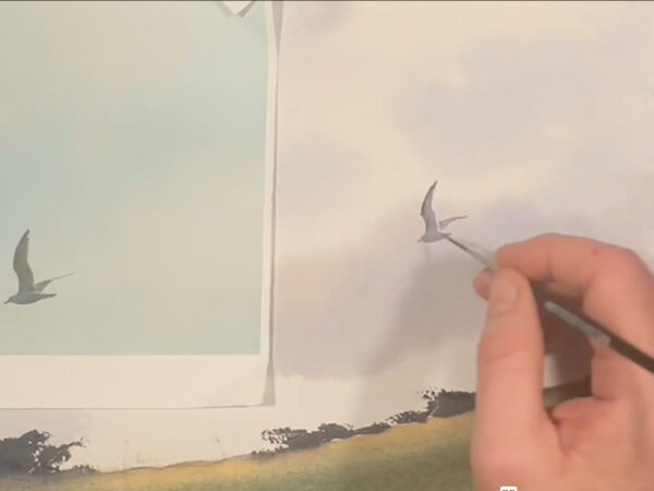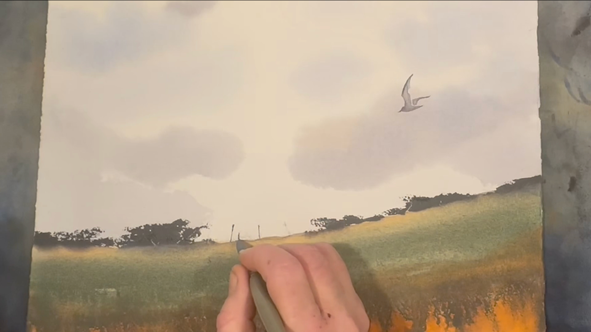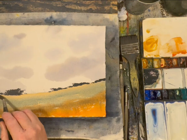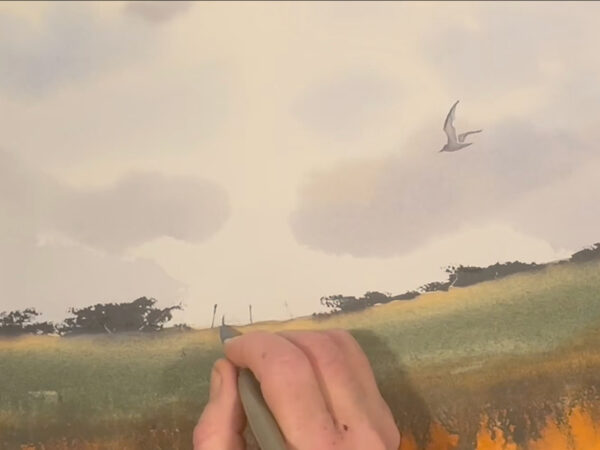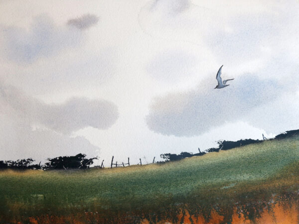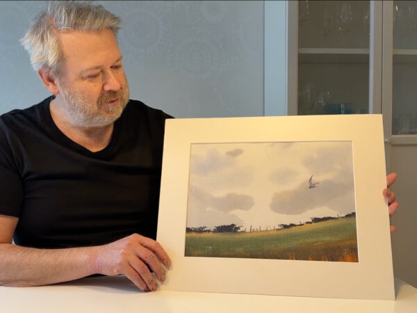 Vi tillbringar vår semester mestadels i Varberg, längst ut på Getteröns femte vik. Det här motiv kommer därifrån och jag målar utifrån mina upplevelser från denna vackra plats. I lektionen målar jag en himmel med moln, kulle med buskar, en grind och flygande mås. Lektionen är inspelad med hög filmkvalitet och har visats för onlinekursen Akvarell Akademin 2024
