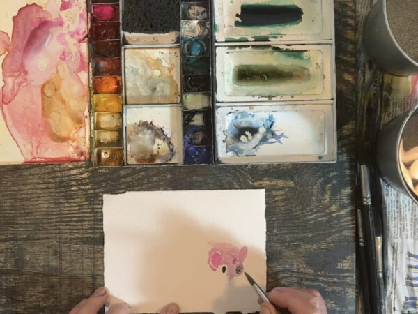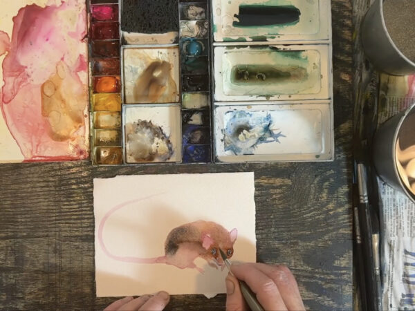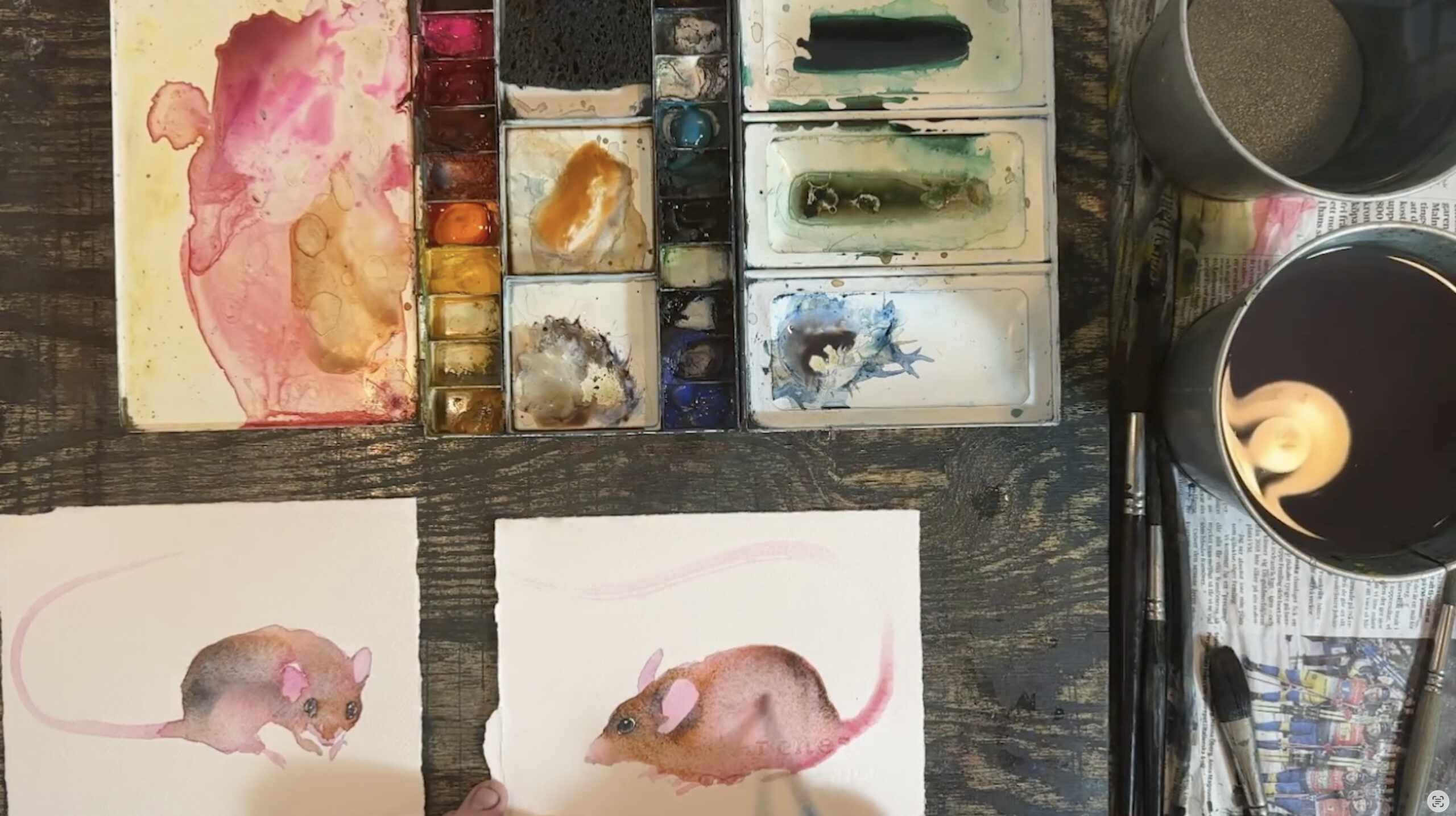 Vill du måla möss så visar jag tips på hur man kan gestalta dem. Möss är oftast bruna, men målar dem rosa med inslag av bruna toner. I lektionen målar jag två möss och bygger upp dem med olika lager. Lektionen är inspelad med hög filmkvalitet och har visats för onlinekursen Akvarell Akademin 2024