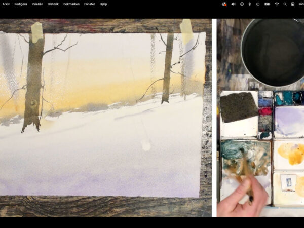 I det här akvarellfilmen målar jag ett vintermotiv med långa kastskuggor. I lektionen lär jag ut hur man kan måla träd, grenar, och jobba långsiktigt. Jag skissar en miniatyrskiss och visar hur man kan jobba med bildkomposition med inspiration från förlagan. Därefter målar jag motivet steg för steg. Du kan pausa, stanna och streama filmen i din egen takt och måla ett liknande motiv. I köpet av akvarellfilmen ingår tre filmer och en pdf i ett modulsystem.